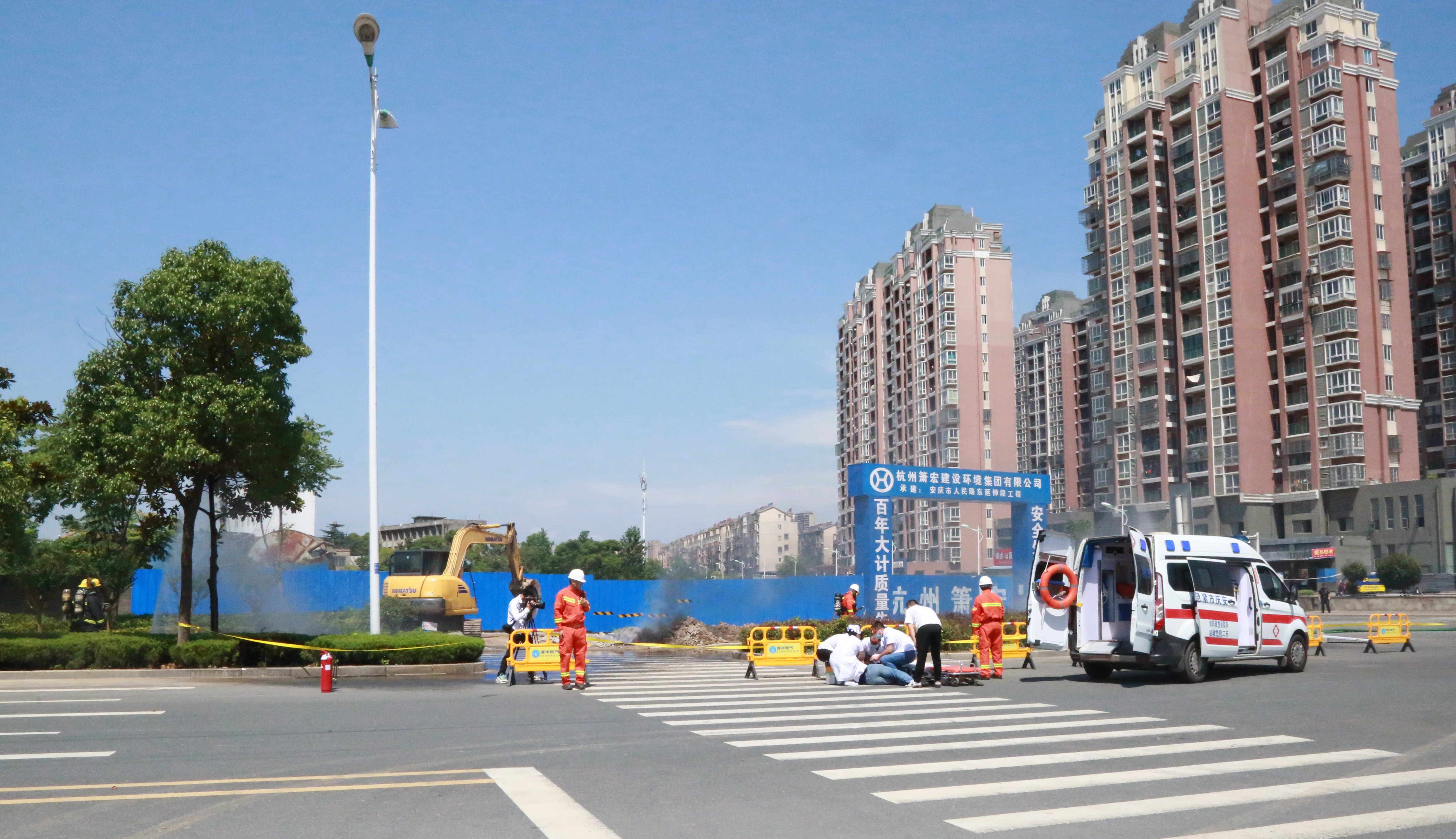 本次演練現(xiàn)場模擬了因第三方施工單位違章作業(yè)挖破安慶市迎江區(qū)獨秀大道水岸花都小區(qū)南側(cè)(獨秀大道與華中東路交叉口南行約200米)的地下中壓天然氣管道,引發(fā)天然氣泄漏后遇火源發(fā)生爆燃,造成多名人員受傷,同時泄漏的燃氣還竄至附近水岸花都小區(qū)市政管網(wǎng),隨時可能引發(fā)爆炸事故,威脅小區(qū)約3000戶居民及商戶生命財產(chǎn)安全。接到報警電話后,安慶港華燃氣與市公安局、市消防救援支隊、市衛(wèi)健委、迎江區(qū)政府、龍獅橋鄉(xiāng)政府等單位及時組織力量趕赴現(xiàn)場,并按照《安慶市城市燃氣事故應急預案》要求協(xié)同配合,有序開展現(xiàn)場警戒、群眾疏散、傷員救治、消防救援、搶險搶修等應急處置工作。