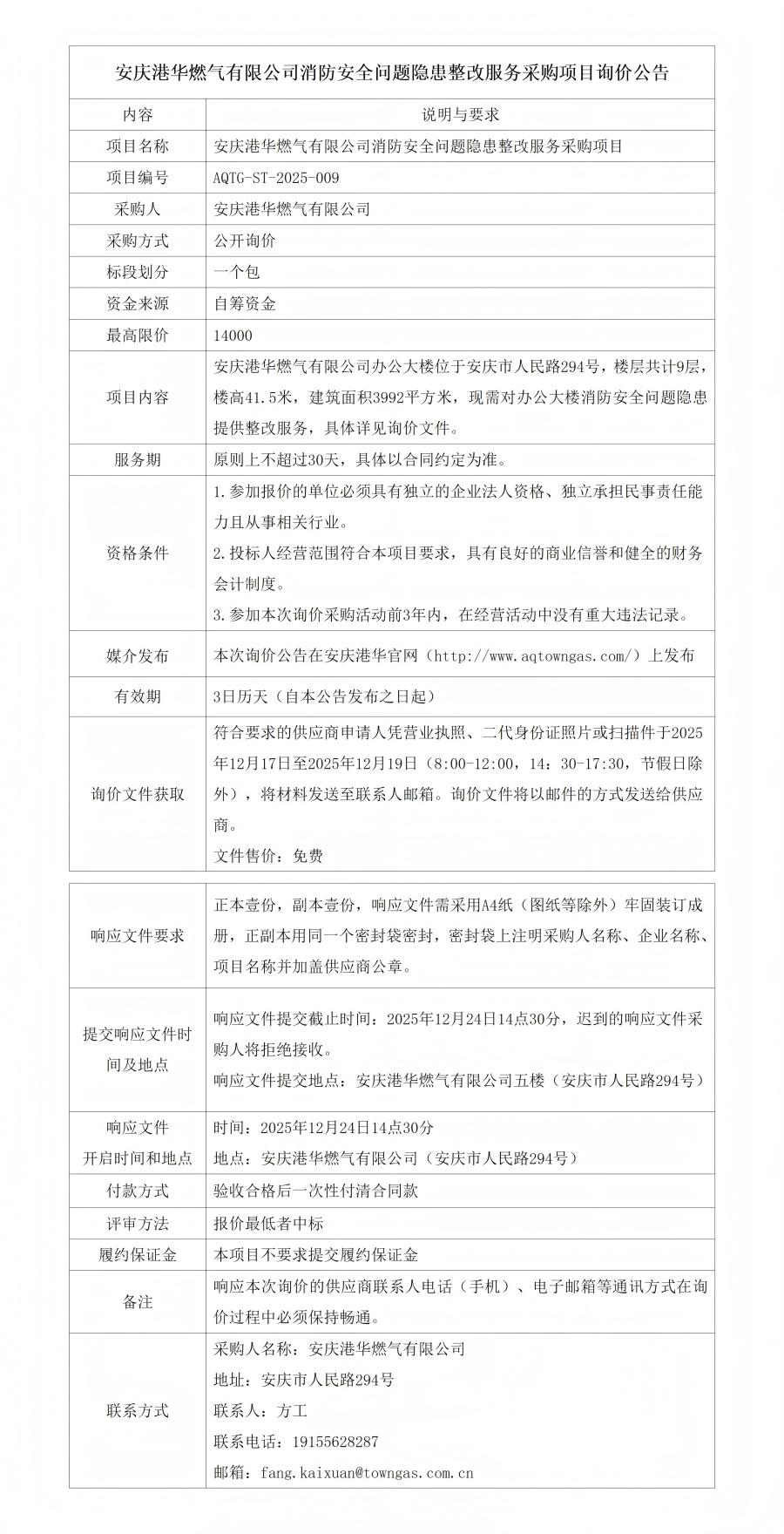 安慶港華燃?xì)庥邢薰鞠腊踩珕栴}隱患整改服務(wù)采購(gòu)項(xiàng)目詢價(jià)公告